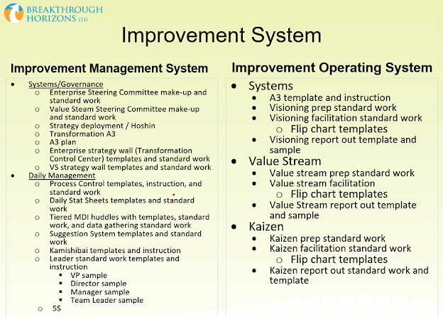 Another word of caution. Leaders love improvement workshops because it requires change at the process level that primarily affects line staff. Leaders can "lead" while the doers "do". Leaders frequently less love the management system because it requires a major re-wiring of how leaders organize and spend their day. Leaders have to "do" the management system. Without this behavior and corresponding culture change, processes will migrate back to status quo which negates the effectiveness of the improvement system.